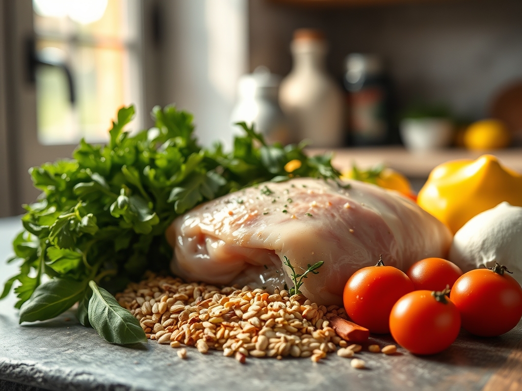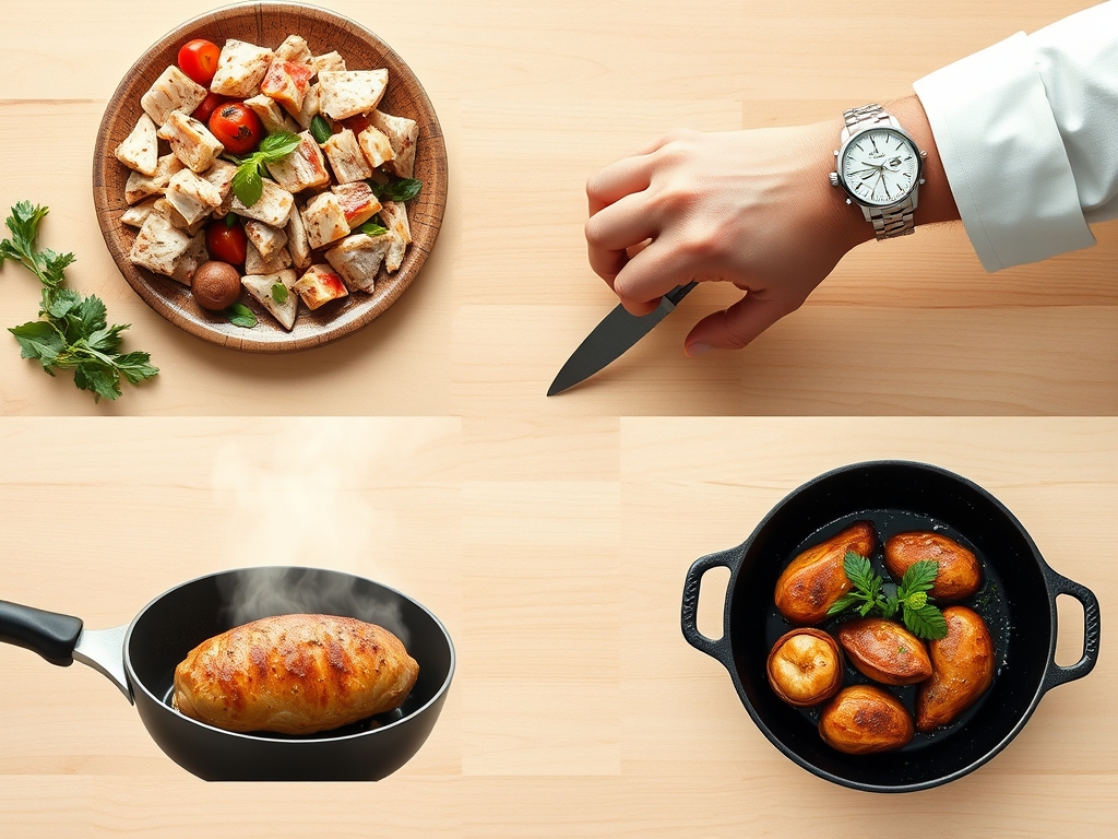 As you see in the ingredient spread below, the raw boneless, skinless chicken breasts (4 pieces, about 6-8 oz each) sit front and center, their pale pink surface ready to transform. Flank them with kosher salt (1 tablespoon), freshly cracked black pepper (1 teaspoon), extra-virgin olive oil (3 tablespoons), and unsalted butter (2 tablespoons) for fat layering. Garlic cloves (6, smashed) and fresh thyme sprigs (4-5) provide aromatic backbone. A small dish holds Dijon mustard (2 tablespoons), which acts as an emulsifier and moisture barrier. Lemon zest (from 1 lemon) and a splash of dry white wine (1/4 cup) round out the acid component, essential for tenderizing surface proteins.