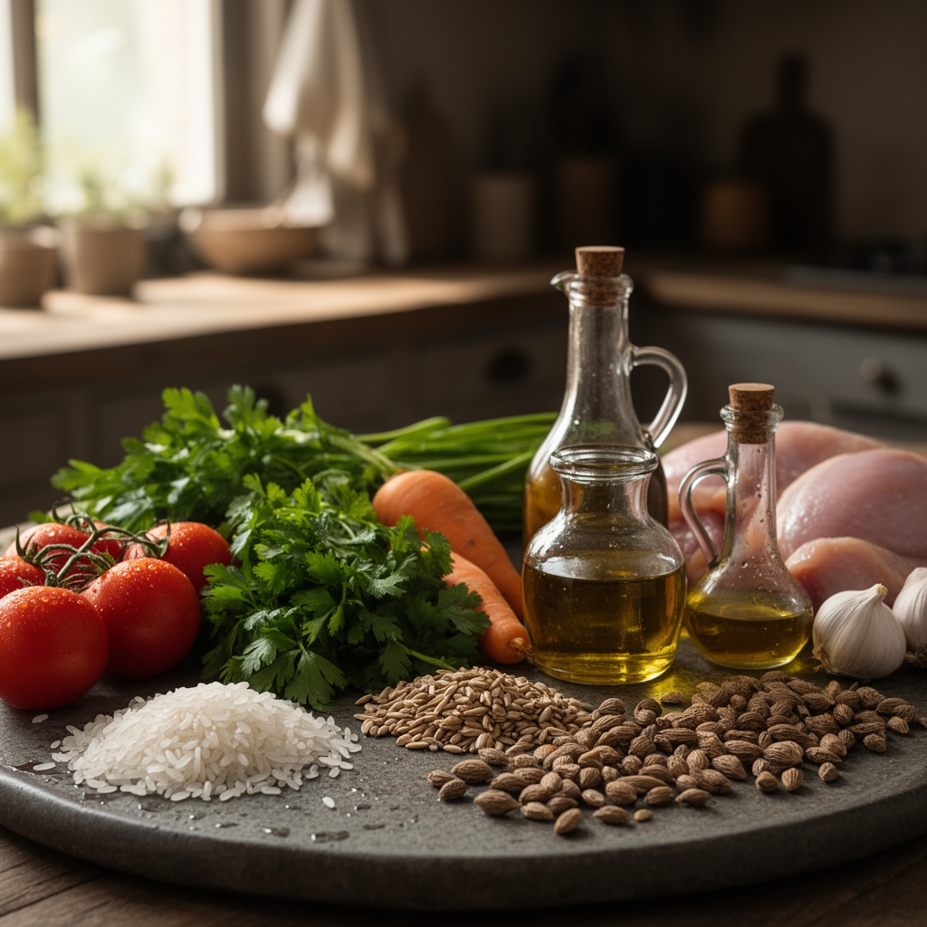 As you see in the ingredient spread below, the foundation starts with bone-in, skin-on chicken thighs (around 1.2 kg total), their marbling visible beneath translucent skin. Choose long-grain basmati or jasmine rice (400 g uncooked) for its resilient structure; short-grain varieties turn gummy under extended heat. Yellow onions (2 medium, diced fine) provide sulfurous sweetness, while garlic cloves (6, smashed) release allicin when crushed rather than minced.