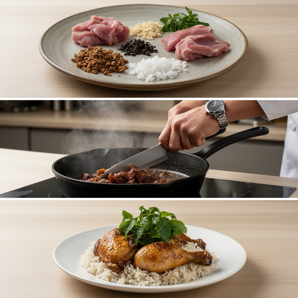 Chef's Flow: While chicken sears (8 minutes), toast spices in a dry pan and rinse rice until water runs clear. As aromatics bloom (3 minutes), chicken rests on a plate, reabsorbing myoglobin. Layer rice into the pan, nestle chicken on top, then cover and ignore for 30 minutes. Carryover heat finishes the cook during a 5-minute rest, freeing you to prep garnish.