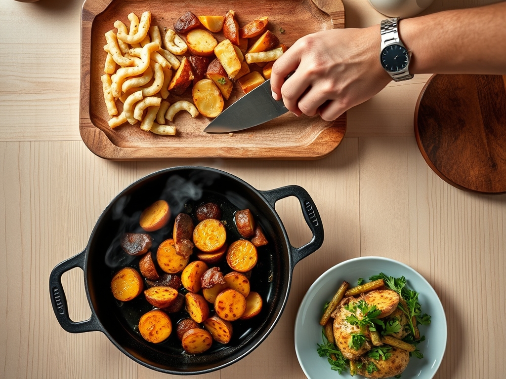 The flow begins by preheating your oven with the heavy-bottomed skillet or baking sheet already inside. This ensures that the moment the potatoes hit the metal, the heat transfer is instantaneous, preventing the starch from sticking to the surface.